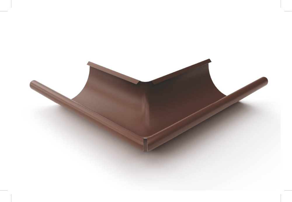 Угол желоба внешний 90° металл OSNO (RAL 8017 шоколад) 125*90мм (16шт/кор) - элемент водосточной системы, предназначенный для изменения направления потока воды, монтируется на внутренних или внешних (в зависимости от исполнения) углах кровли. Преимущества: двустороннее полимерное покрытие, выполнен бесшовным способом.